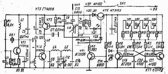 Командные мультивибраторы настраивают подборкой резисторов, включаемых последовательно с кнопками, на частоты 1080, 1320, 1610, 1970, 2400 Гц — верхний мультивибратор; 2940, 3580, 4370, 5310, 6500 Гц — нижний,
