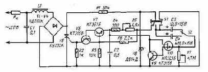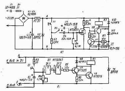 В устройстве можно применить любые диоды, рассчитанные на прямой ток не менее 3 А и обратное напряжение не менее 400 В. Транзисторы V6, V9 — любые из серий КТ312, КТ315; V7 любой из серий КТ361, КТ2ОЗ. Вместо КП303Б можно применить транзистор КПЗОЗА. Статический коэффициент передачи тока биполярных транзисторов должен быть не менее 50. При использовании полевого транзистора другой серии, например КП302А, выдержка уменьшается из-за большего напряжения отсечки этого транзистора. Конденсаторы СЗ и С4 должны иметь возможно меньший ток утечки.
