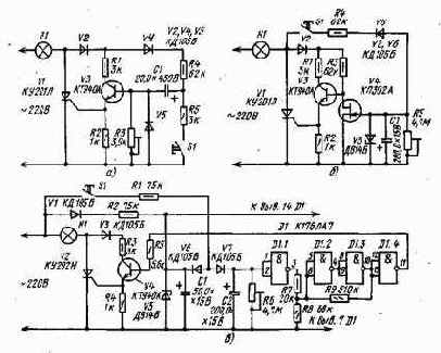 При замыкании контактов выключателя S2 конденсатор С1 разряжается, и снова загорается лампа. HI. Лампа будет гореть до размыкания контактов выключателя S1. Очередной запуск устройства производят кратковременным включением выключателя S2 (при включенном S1). Нужную выдержку устанавливают переменным резистором R4.