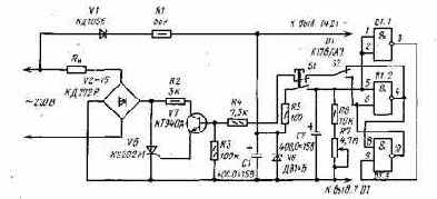 При поступлении напряжения высокого уровня на базу транзистора V7 он открывается, пропуская ток по цепи управляющего электрода тринистора V6. Открывающийся в начале каждого полупериода тринистор обеспечивает протекание номинального тока через нагрузку RH. При нажатии на кнопку S1 током через резистор R5 заряжается конденсатор С2. На выходах элементов D1.1 и D1.2 устанавливаются напряжения низких уровней, на выходе D1.3 — напряжение высокого уровня. Транзистор и тринистор закрыты. При отпускании кнопки S1 конденсатор С2 разряжается через резисторы R6 и R7. При напряжении на конденсаторе С2 около 4,5 В, логические элементы переключаются в исходное состояние. Транзистор V7 и тринистор V6 открываются или закрываются в зависимости от положения переключателя S2.